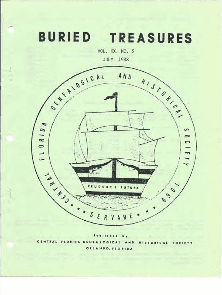 Burled TREASURES VOL. XXI NO. 3 JULY 1988 AND Pull ls h e d Central FLORIDA GENEALOGICAL lay AND 0 R LA N D 0, F L 0 RID A HISTORICAL SOCIETY Tables OF CONTENTS President's Message. Ii Gone to Nebraska