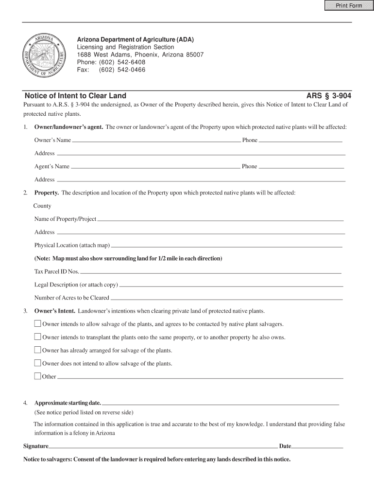 Print Form Arizona Department of Agriculture (ADA) Licensing and Registration Section 1688 West Adams, Phoenix, Arizona 85007 Phone: (602) 5426408 Fax: (602) 5420466 Notice of Intent to Clear Land