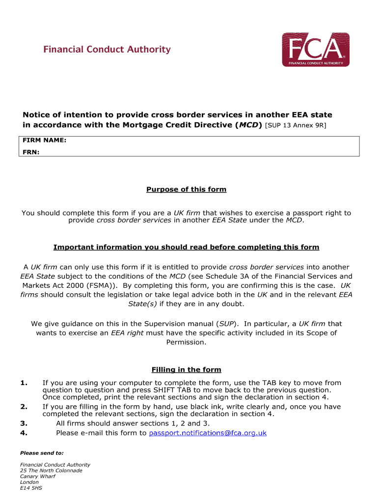 EEA IMD Cross Border Services Form Notice of intention to provide cross border services in another EEA state in accordance with the Mortgage Credit Directive (MCD) SUP 13 Annex 9R FIRM NAME: FAN: