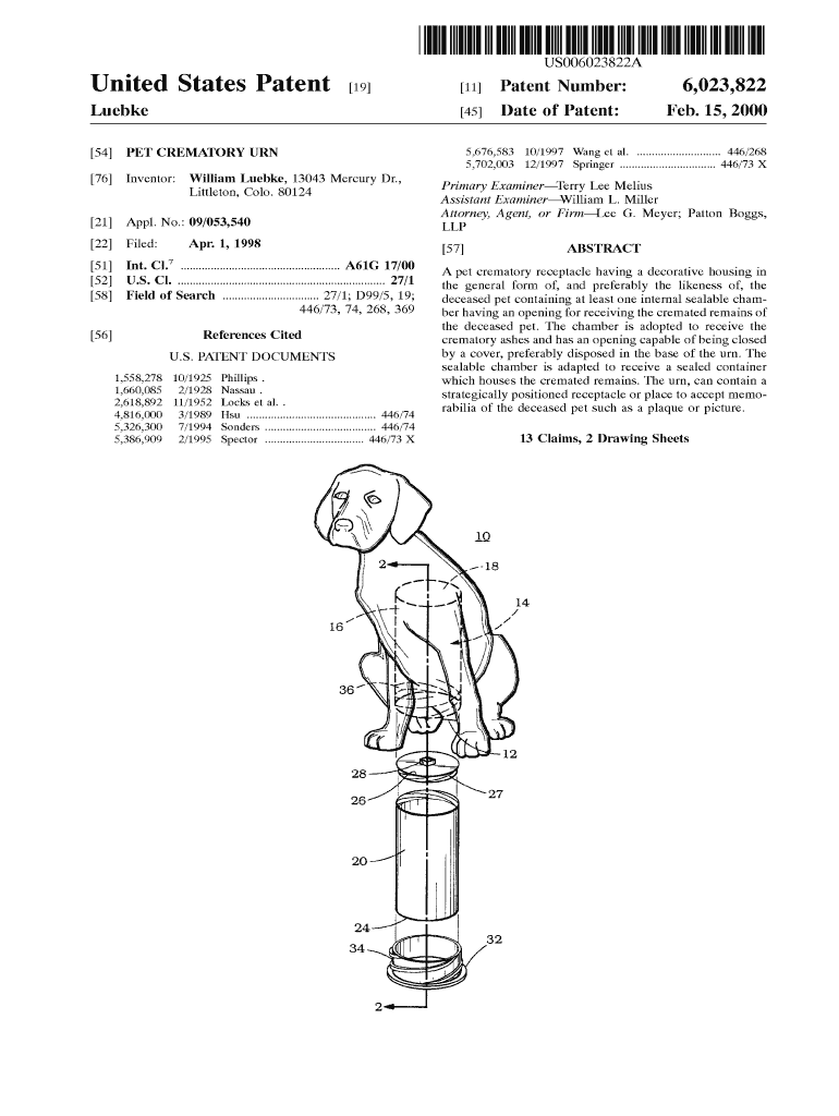 US006023822A United States Patent 19 11 Patent Number: Luke 45 54 PET CREMATORY URN Date of Patent: 6,023,822 Feb. 15, 2000 5,676,583 76 Inventors: William Luke, 13043 Mercury Dr., Littleton, C010