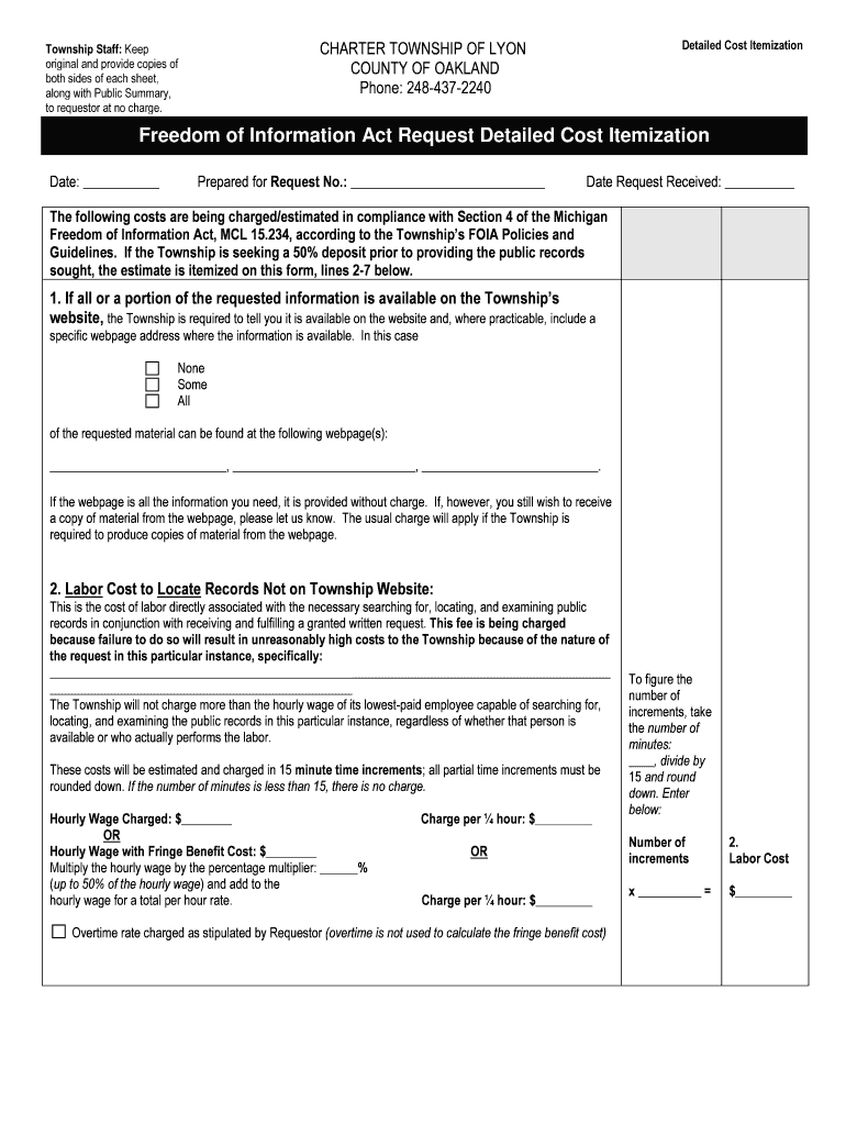 Detailed Cost Itemization CHARTER TOWNSHIP OF LYON COUNTY OF OAKLAND Phone: 2484372240 Township Staff: Keep original and provide copies of both sides of each sheet, along with Public Summary, to requestor