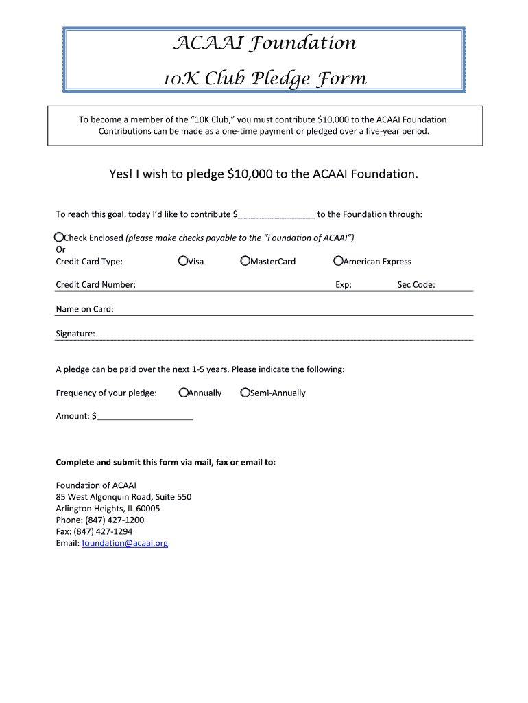 AC AAI Foundation 10K Club Pledge Form To become a member of the 10K Club, you must contribute $10,000 to the AC AAI Foundation. Contributions can be made as a onetime payment or pledged over a five-year