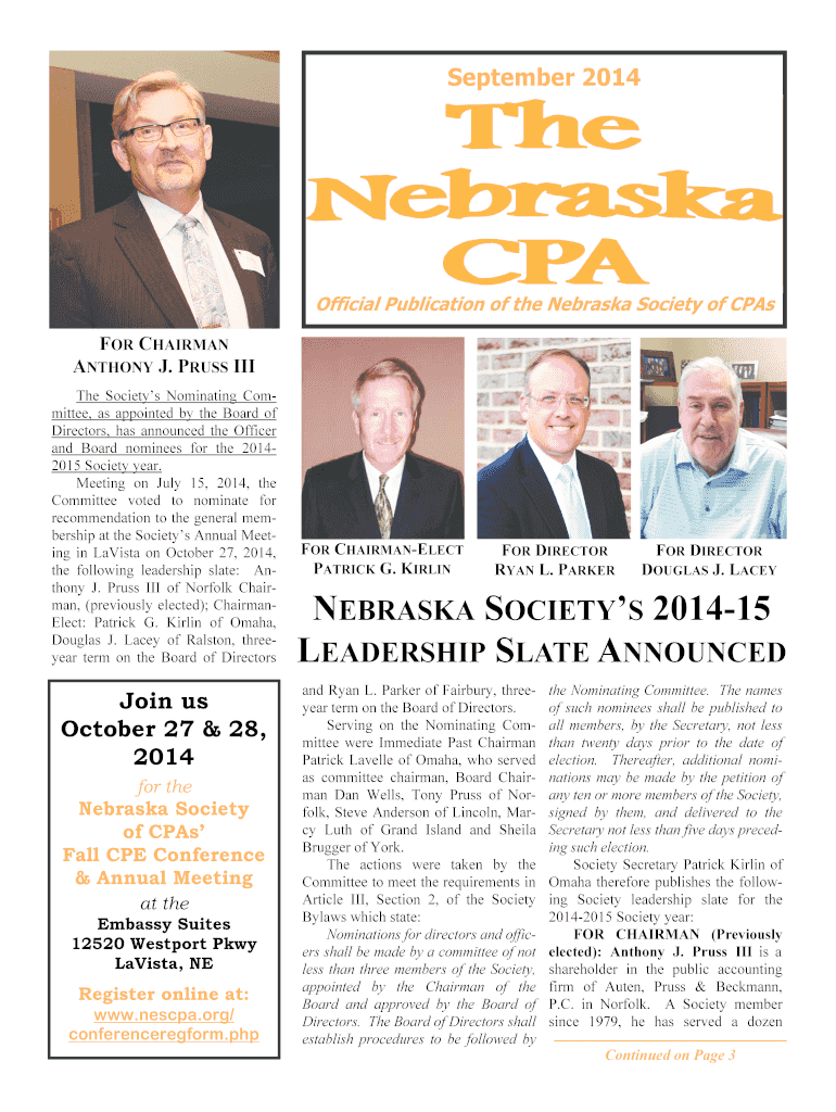 September 2014 Official Publication of the Nebraska Society of CPA's FOR CHAIRMAN ANTHONY J. PRESS III The Societies Nominating Committee, as appointed by the Board of Directors, has announced the