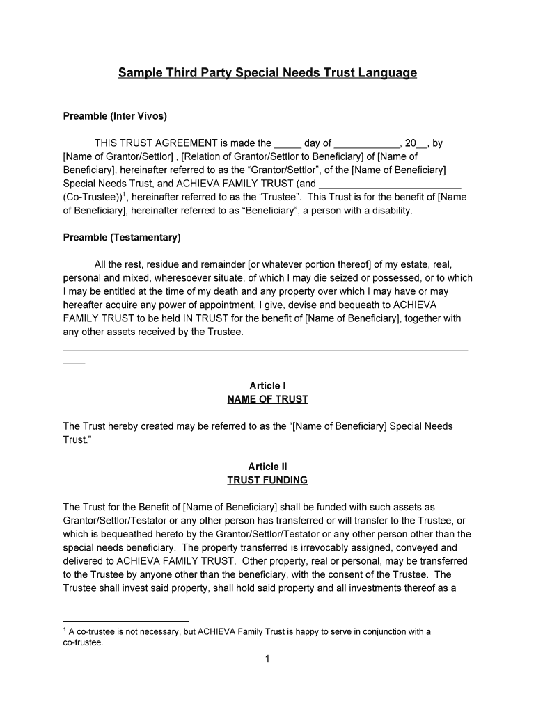 Get the free Sample Third Party Special Needs Trust Language - ACHIEVA - achieva