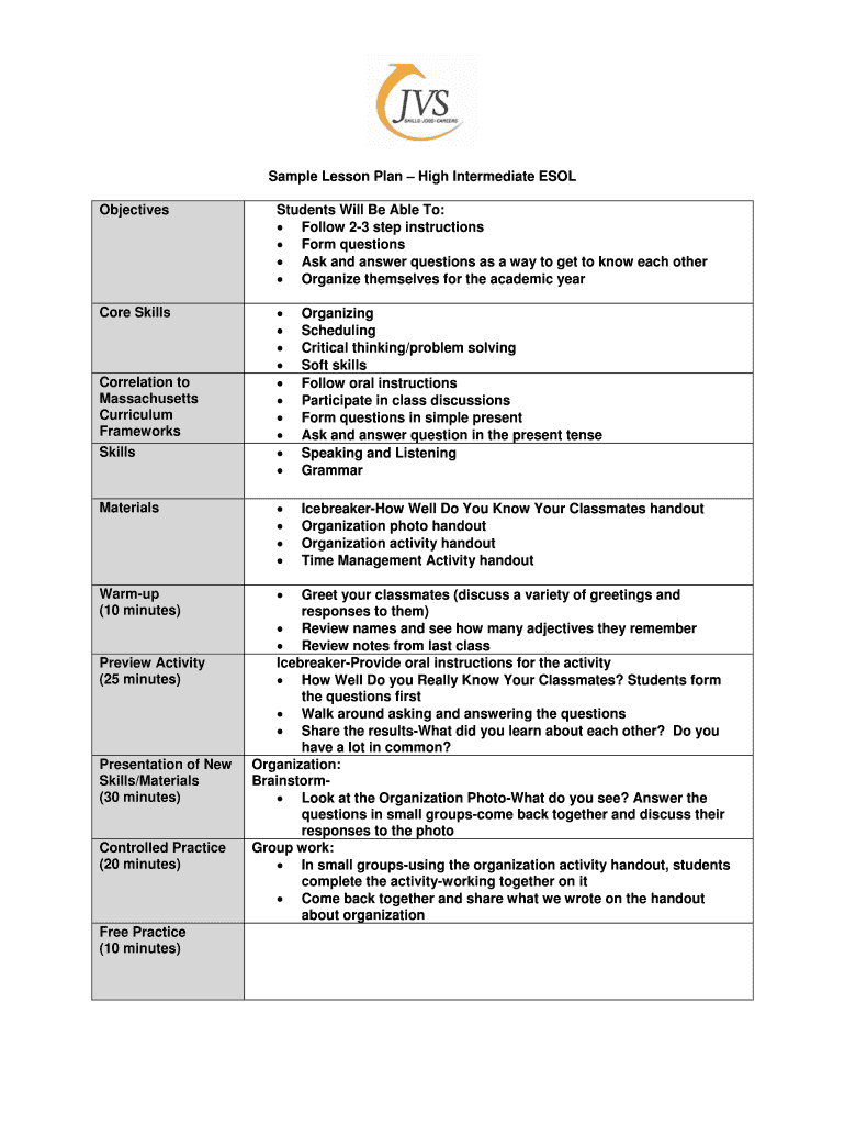 Get the free Sample Lesson Plan High Intermediate ESOL Objectives Students - collegetransition