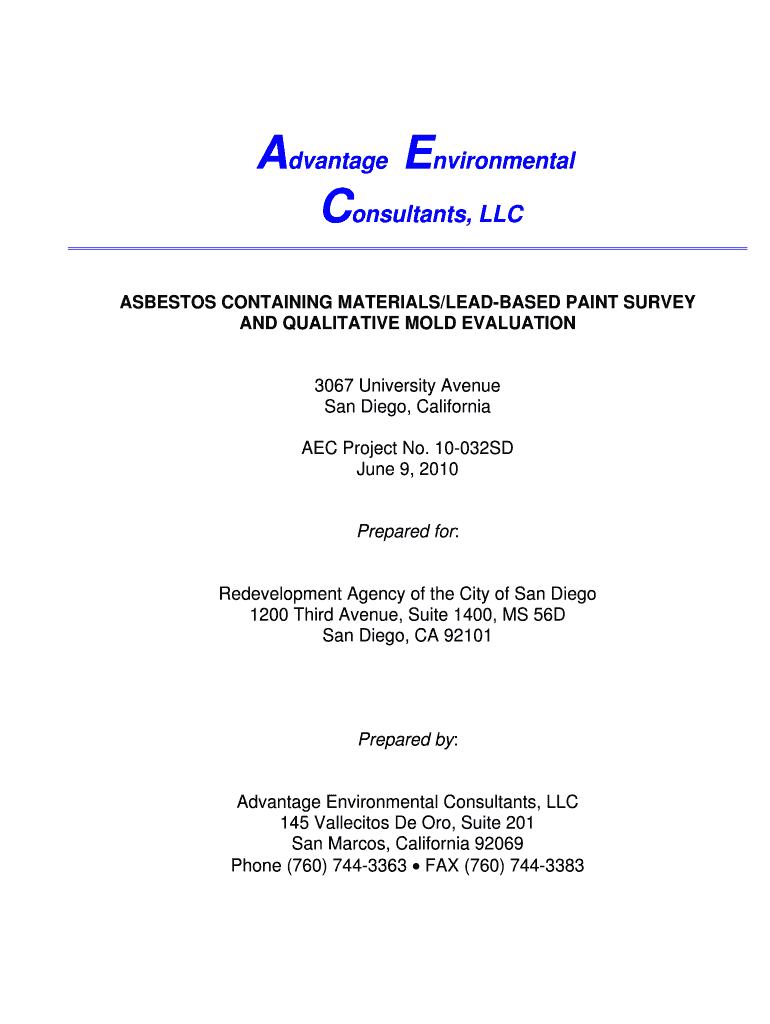 This document is a survey report conducted by Advantage Environmental Consultants, LLC on asbestos containing materials and lead-based paint for a property in San Diego. It details the methodology,