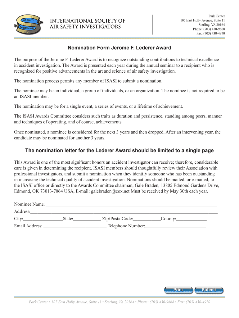 INTERNATIONAL SOCIETY OF AIR SAFETY INVESTIGATORS Park Center 107 East Holly Avenue, Suite 11 Sterling, VA 20164 Phone: (703) 4309668 Fax: (703) 4304970 Nomination Form Jerome F. Federer Award The