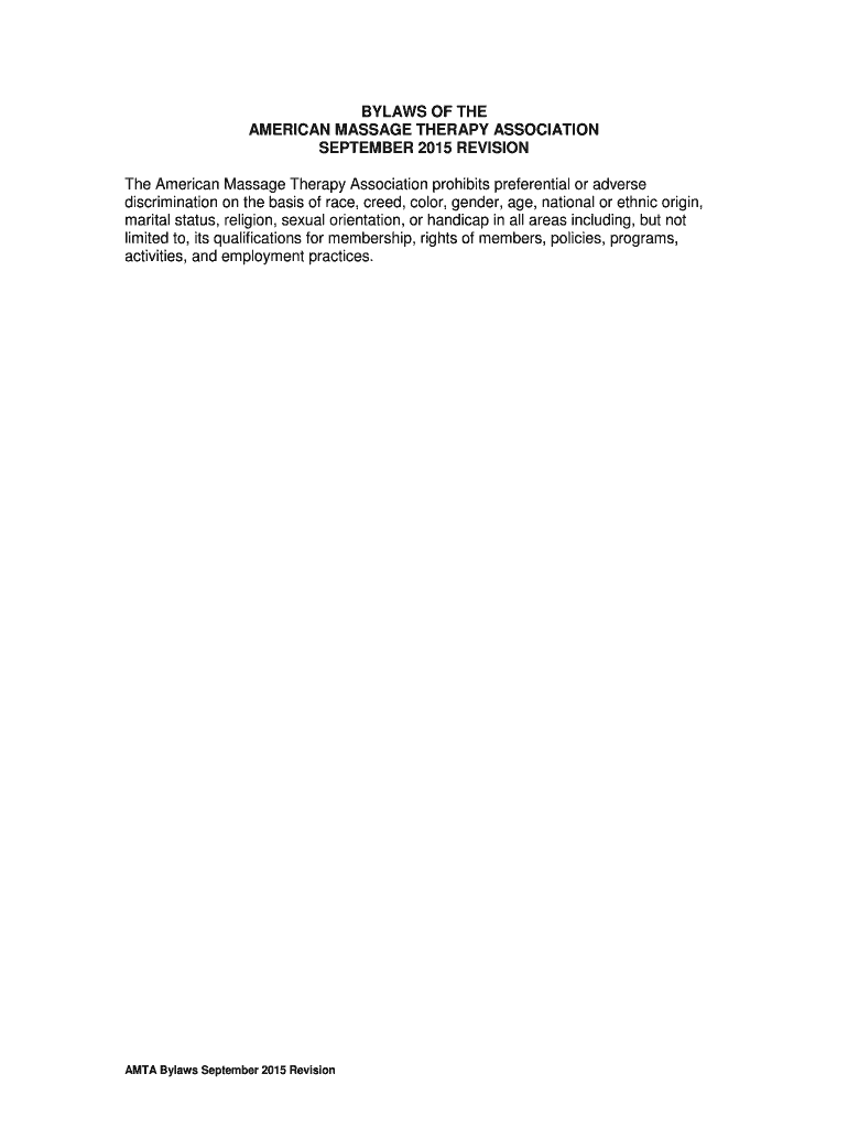 BYLAWS OF THE AMERICAN MASSAGE THERAPY ASSOCIATION SEPTEMBER 2015 REVISION The American Massage Therapy Association prohibits preferential or adverse discrimination on the basis of race, creed, color,