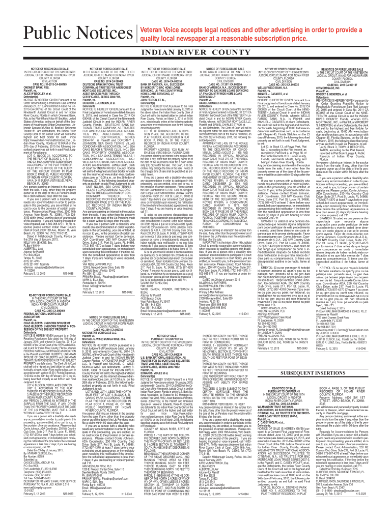 Public Notices Veteran Voice accepts legal notices and other advertising in order to provide a quality local newspaper at a reasonable subscription price. INDIANRIVERCOUNTY NOTICE OF RESCHEDULED SALE