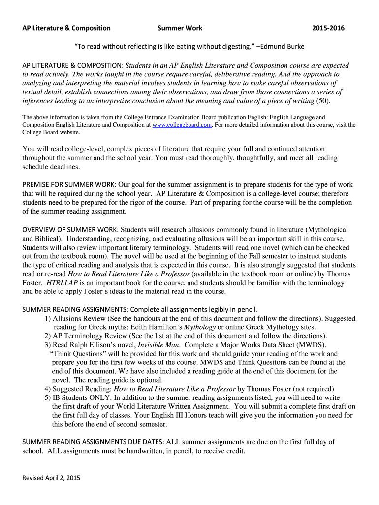 AP Literature & Composition Summer Work 20152016 To read without reflecting is like eating without digesting. Edmund Burke AP LITERATURE & COMPOSITION: Students in an AP English Literature and Composition