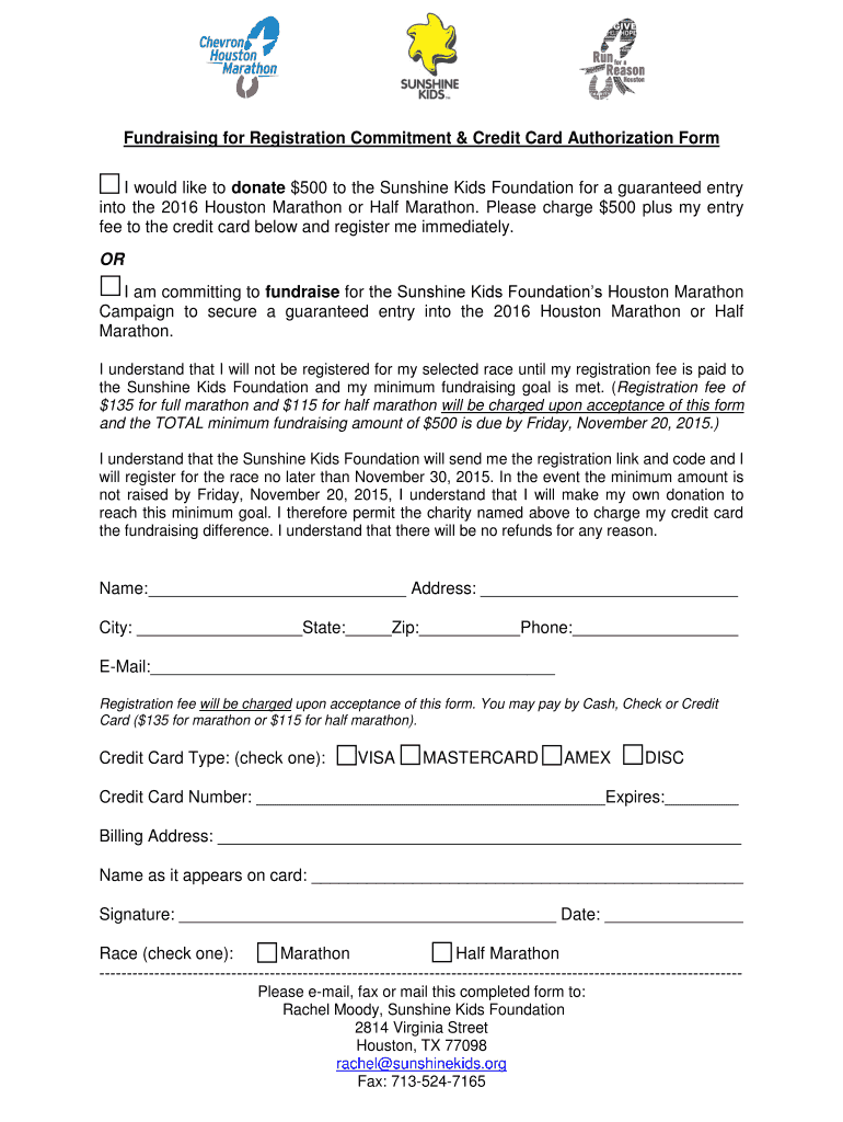 Fundraising for Registration Commitment & Credit Card Authorization Form I would like to donate $500 to the Sunshine Kids Foundation for a guaranteed entry into the 2016 Houston Marathon or Half Marathon.