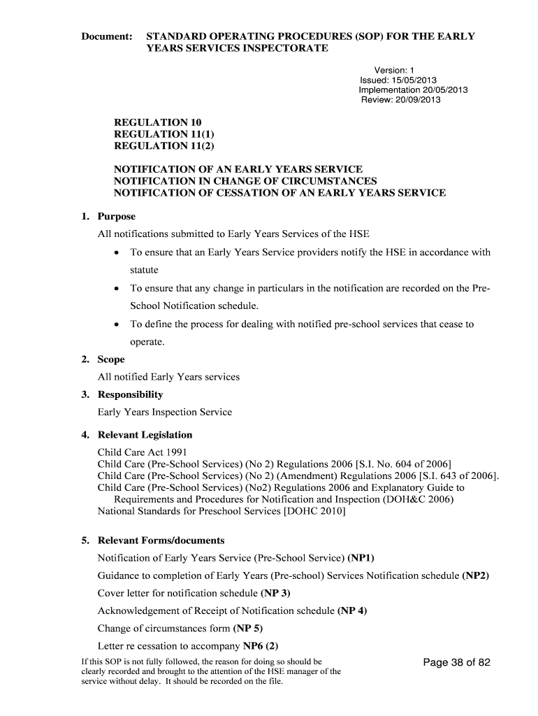 Document: STANDARD OPERATING PROCEDURES (SOP) FOR THE EARLY YEARS SERVICES INSPECTORATE Version: 1 Issued: 15/05/2013 Implementation 20/05/2013 Review: 20/09/2013 REGULATION 10 REGULATION 11(1) REGULATION