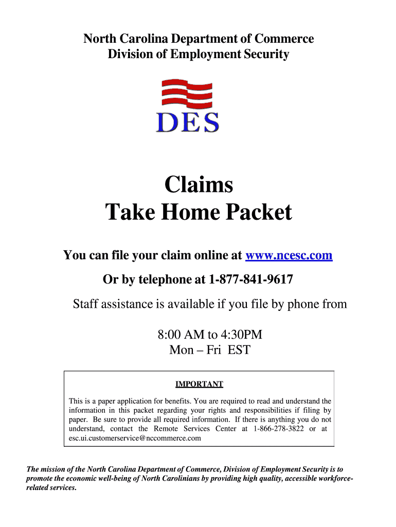 North Carolina Department of Commerce Division of Employment Security Claims Take Home Packet You can file your claim online at www.ncesc.com Or by telephone at 18778419617 Staff assistance is available