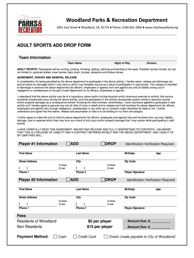 Any adult participant wishing to join or leave a sports team managed by the Woodland Parks & Recreation Department in California is eligible to fill out this form.
