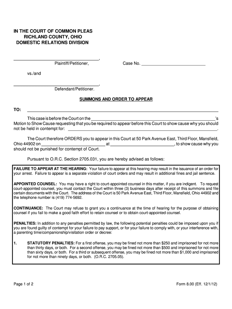 IN THE COURT OF COMMON PLEAS RICHLAND COUNTY, OHIO DOMESTIC RELATIONS DIVISION, Plaintiff/Petitioner, Case No. vs./and, Defendant/Petitioner. SUMMONS AND ORDER TO APPEAR TO: This case is before the