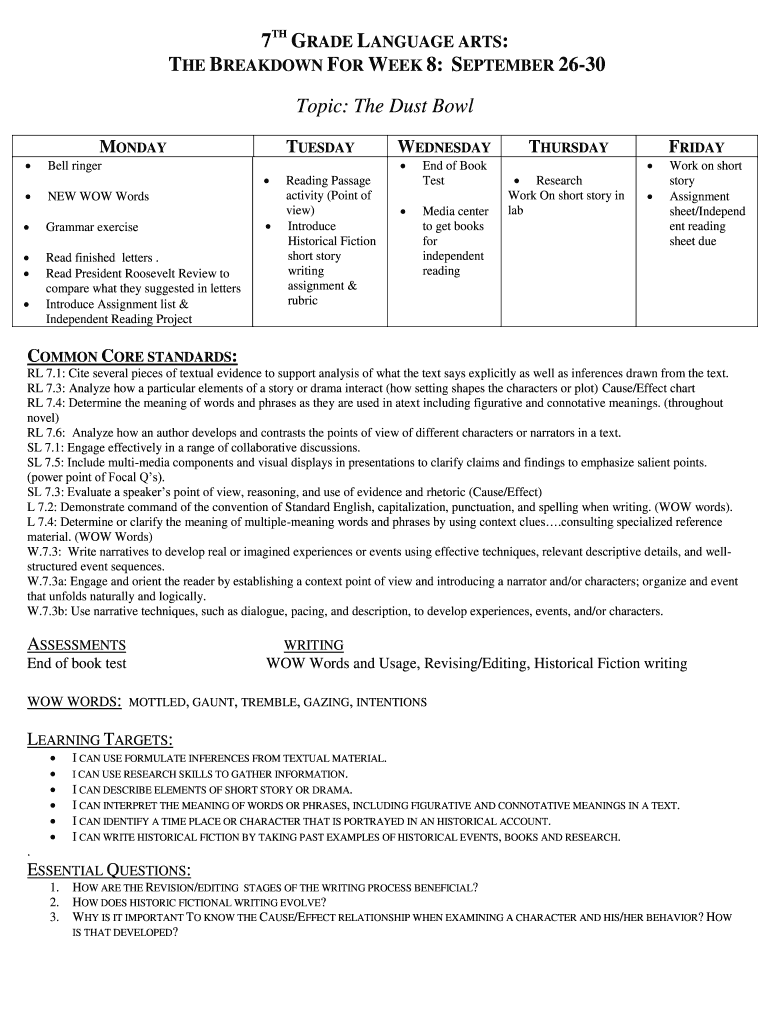 7TH GRADE LANGUAGE ARTS: THE BREAKDOWN FOR WEEK 8: SEPTEMBER 2630 Topic: The Dust Bowl MONDAY Bell ringer NEW WOW Words Grammar exercise Read finished letters. Read President Roosevelt Review to compare