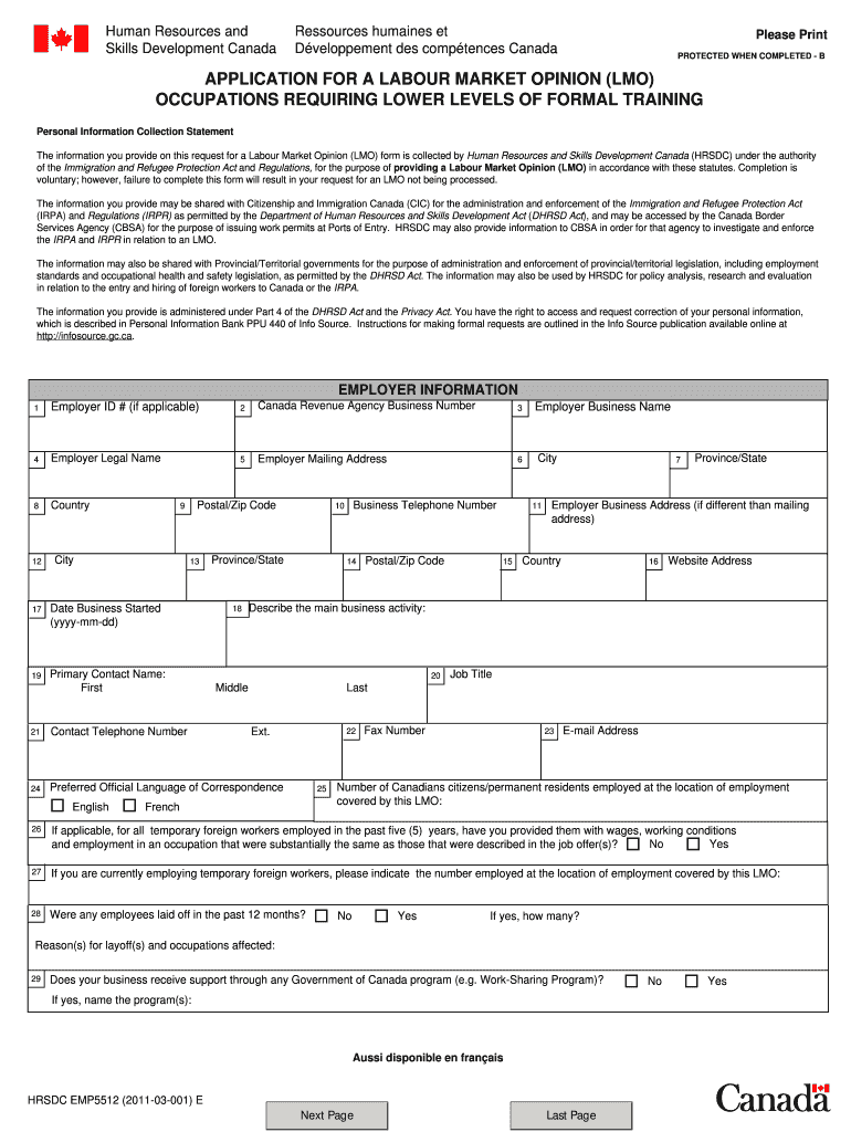 Human Resources and Skills Development Canada Resources human set Development DES competences Canada Please Print PROTECTED WHEN COMPLETED B APPLICATION FOR A Labor MARKET OPINION (LAO) OCCUPATIONS