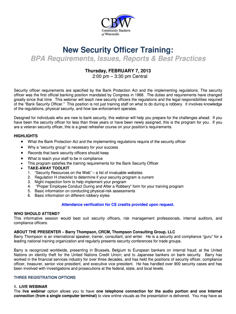 New Security Officer Training: BPA Requirements, Issues, Reports & Best Practices Thursday, FEBRUARY 7, 2013 2:00 pm 3:30 pm Central Security officer requirements are specified by the Bank Protection