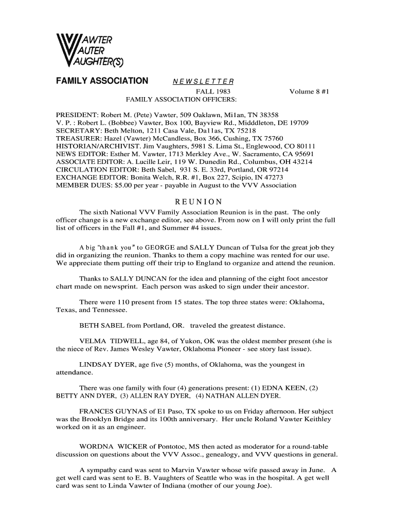 FAMILY ASSOCIATION NEWSLETTER FALL 1983 FAMILY ASSOCIATION OFFICERS: Volume 8 #1 PRESIDENT: Robert M. (Pete) Vaster, 509 Oak lawn, Mi1an, TN 38358 V. P. : Robert L. (Bobbie) Vaster, Box 100, Bayview