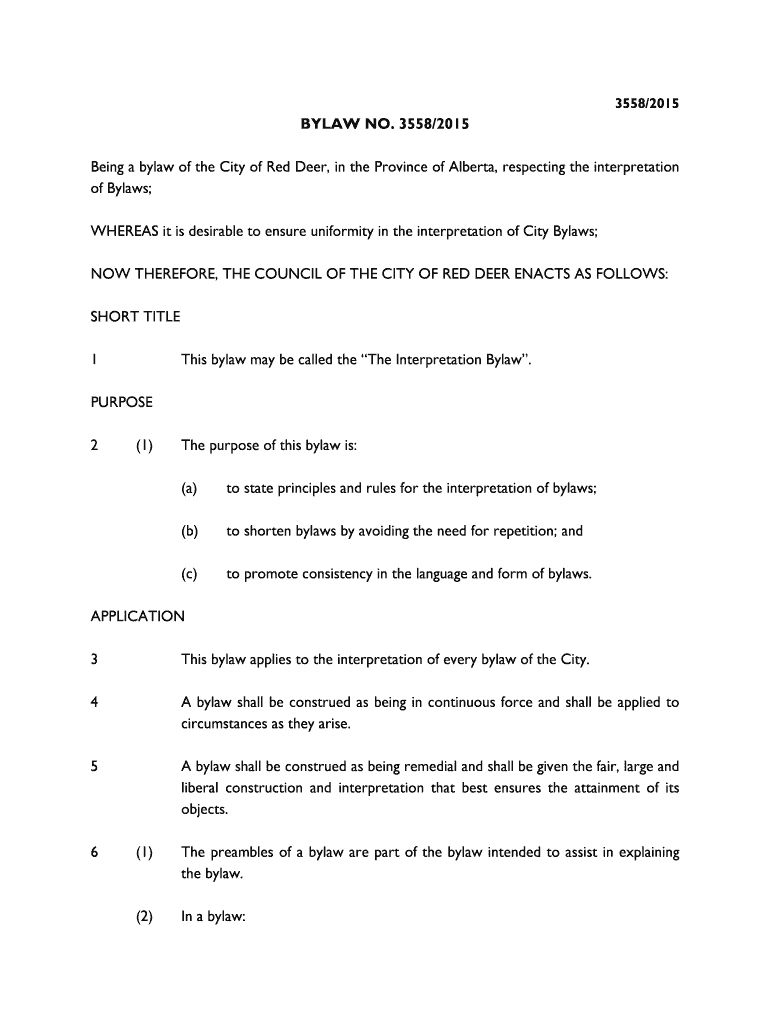 3558/2015 BYLAW NO. 3558/2015 Being a bylaw of the City of Red Deer, in the Province of Alberta, respecting the interpretation of Bylaws; WHEREAS it is desirable to ensure uniformity in the interpretation