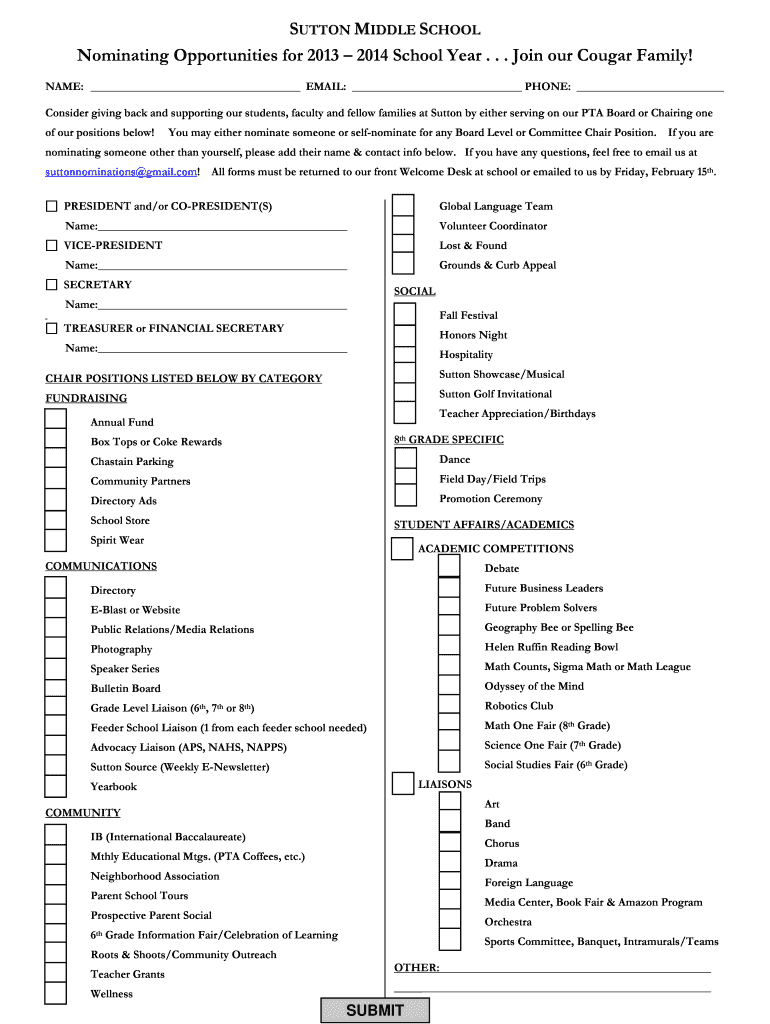 SUTTON MIDDLE SCHOOL Nominating Opportunities for 2013 2014 School Year. . . Join our Cougar Family! NAME: EMAIL: PHONE: Consider giving back and supporting our students, faculty and fellow families
