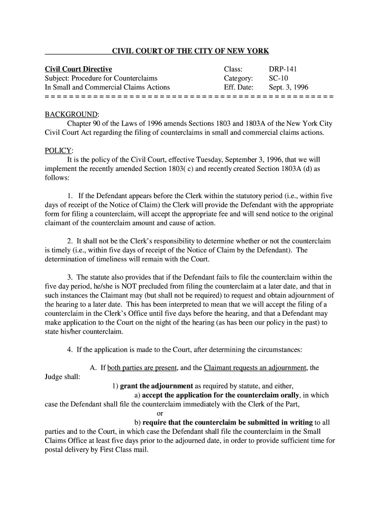 This document outlines the procedures for filing counterclaims in small and commercial claims actions in the Civil Court of the City of New York, effective September 3, 1996.