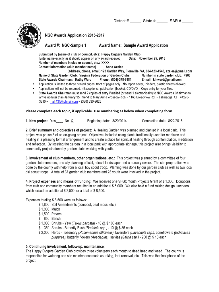 District # State # SAR # NGC Awards Application 20152017 Award #: Sample 1 Award Name: Sample Award Application Submitted by (name of club or council, etc): Happy Diggers Garden Club Enter name exactly