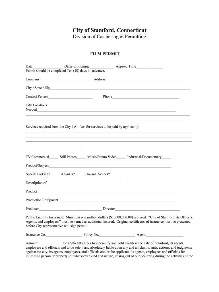 This document serves as a film permit application for filming activities within the City of Stamford, including details about the company, locations, services required, insurance, fees, and required