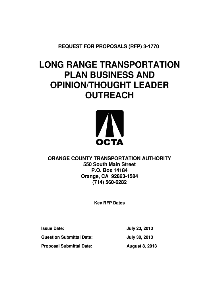 REQUEST FOR PROPOSALS (RFP) 31770 LONG RANGE TRANSPORTATION PLAN BUSINESS AND OPINION/THOUGHT LEADER OUTREACH ORANGE COUNTY TRANSPORTATION AUTHORITY 550 South Main Street P.O. Box 14184 Orange, CA