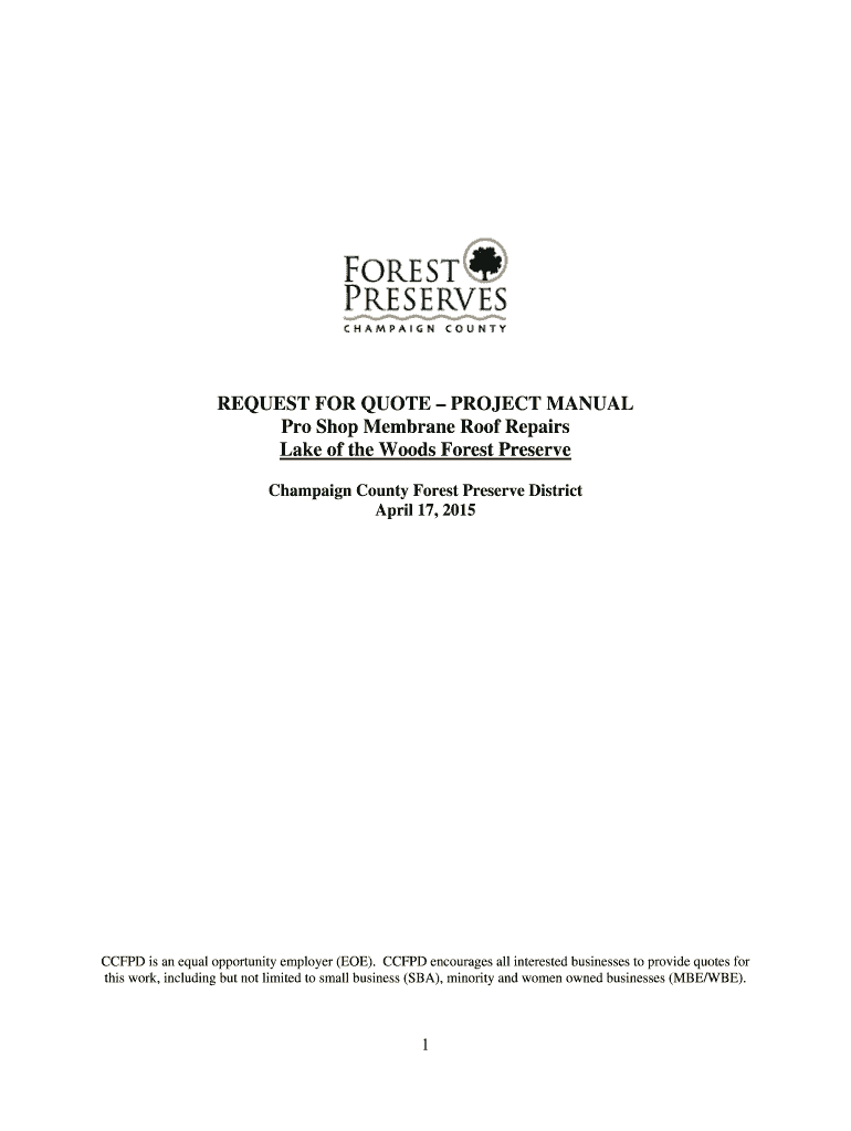 REQUEST FOR QUOTE PROJECT MANUAL Pro Shop Membrane Roof Repairs Lake of the Woods Forest Preserve Champaign County Forest Preserve District April 17, 2015, CCPD is an equal opportunity employer (EOE).