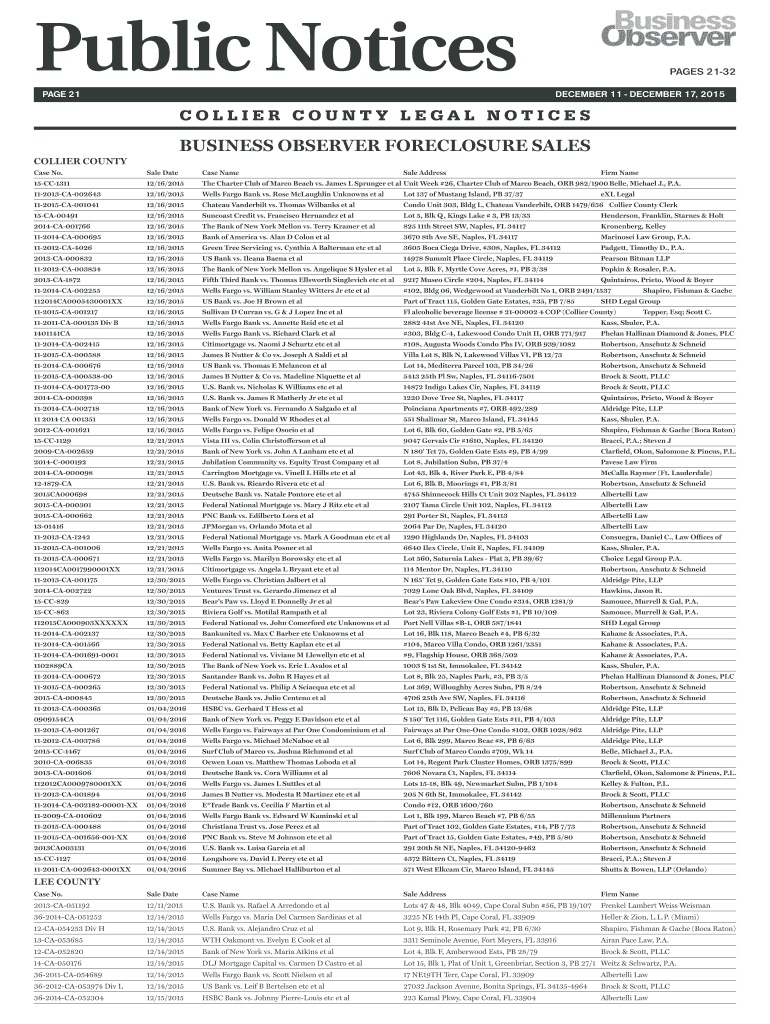 Public Notices PAGE 21 PAGES 2132 DECEMBER 11 DECEMBER 17, 2015, COLLIER COUNTY LEGAL NOTICES BUSINESS OBSERVER FORECLOSURE SALES COLLIER COUNTY Case No. Sale Date Case Name 15CC1311 12/16/2015 The