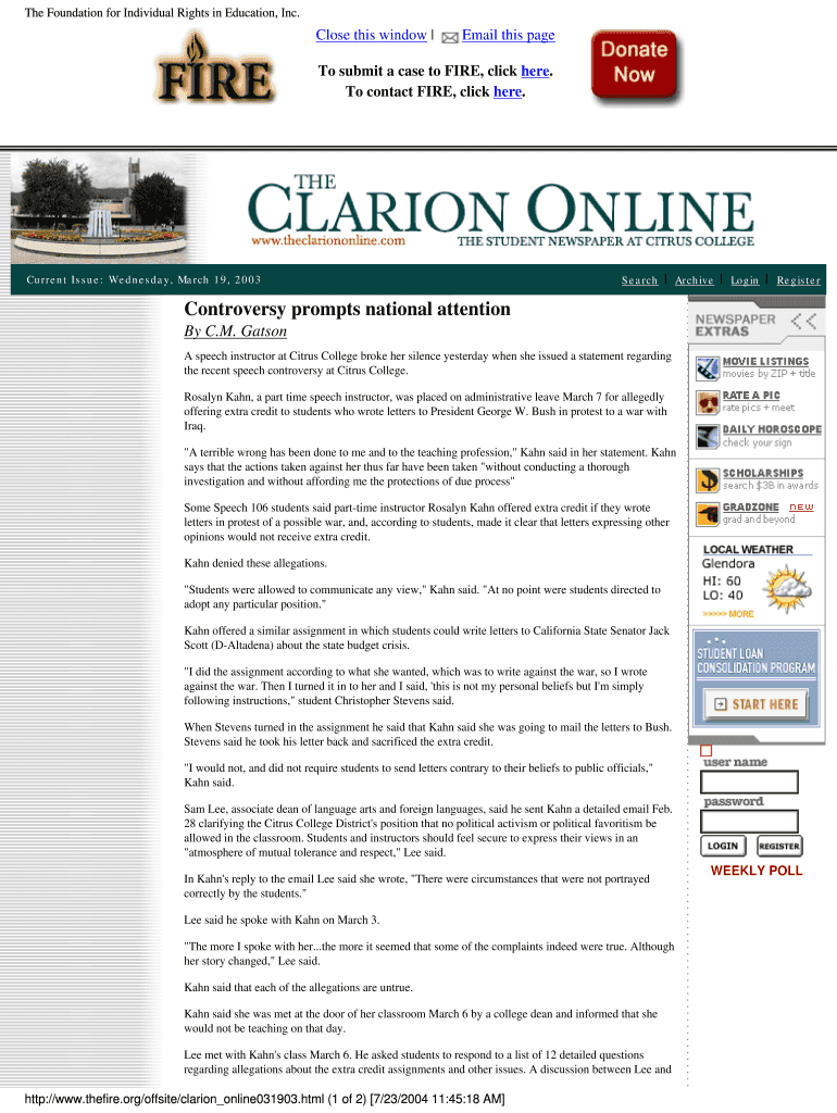 The Foundation for Individual Rights in Education, Inc. Close this window Email this page To submit a case to FIRE, click here. To contact FIRE, click here. Current Issue: Wednesday, March 19, 2003,