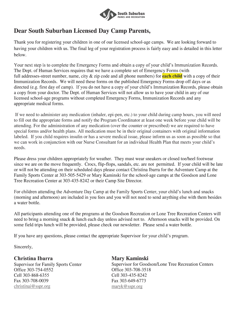 Get the free Dear South Suburban Licensed Day Camp Parents - ssprd