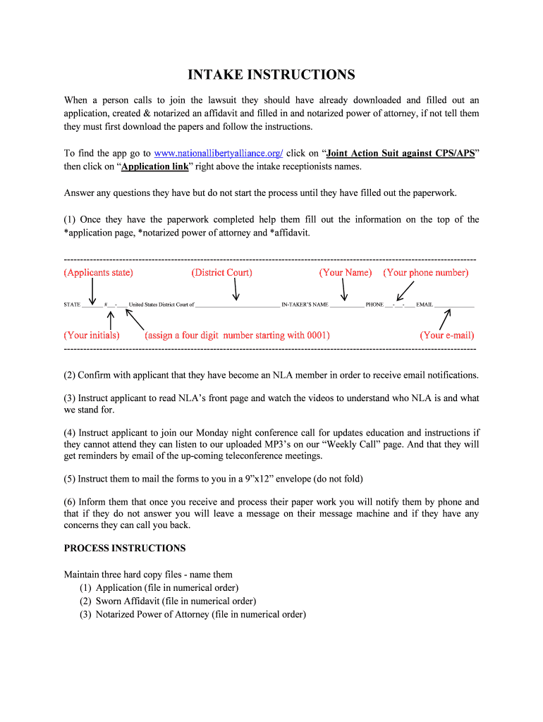 Get the free INTAKE INSTRUCTIONS - National Liberty Alliance