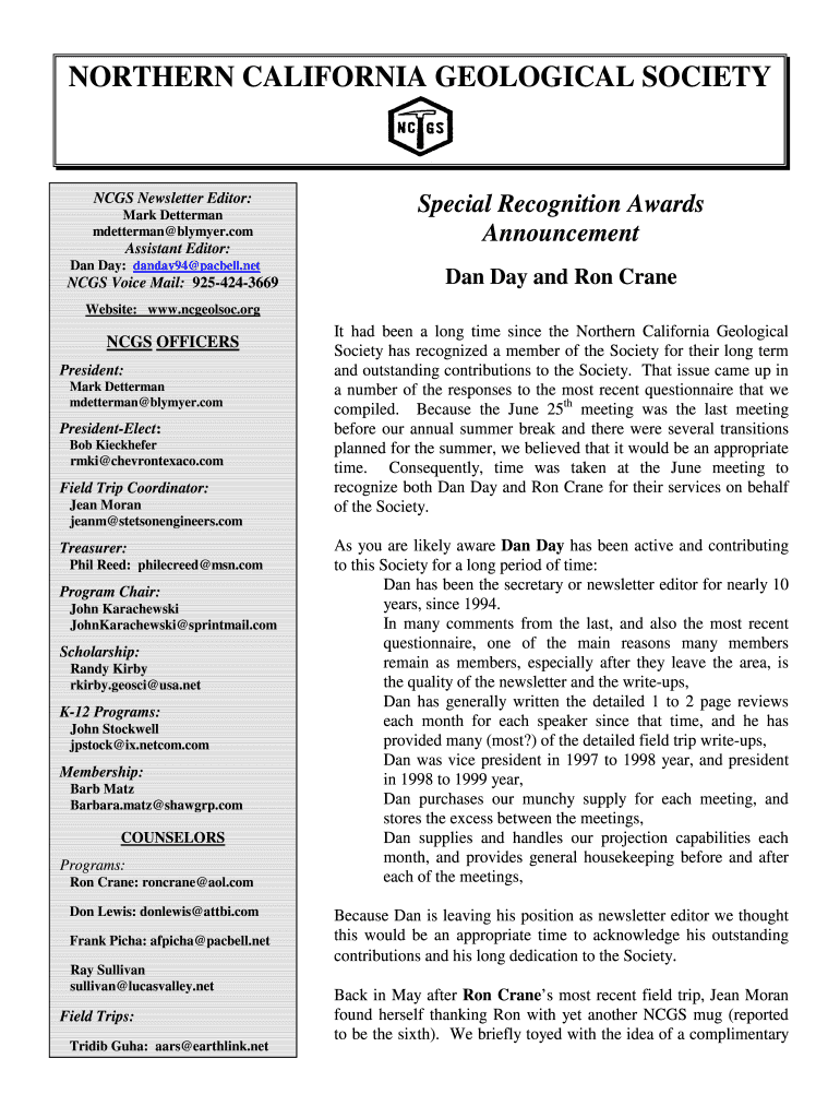 NORTHERN CALIFORNIA GEOLOGICAL SOCIETY CGS Newsletter Editor: Mark Letterman blymyer.com Assistant Editor: Dan Day: danday94 Parnell.net CGS Voice Mail: 9254243669 Special Recognition Awards Announcement