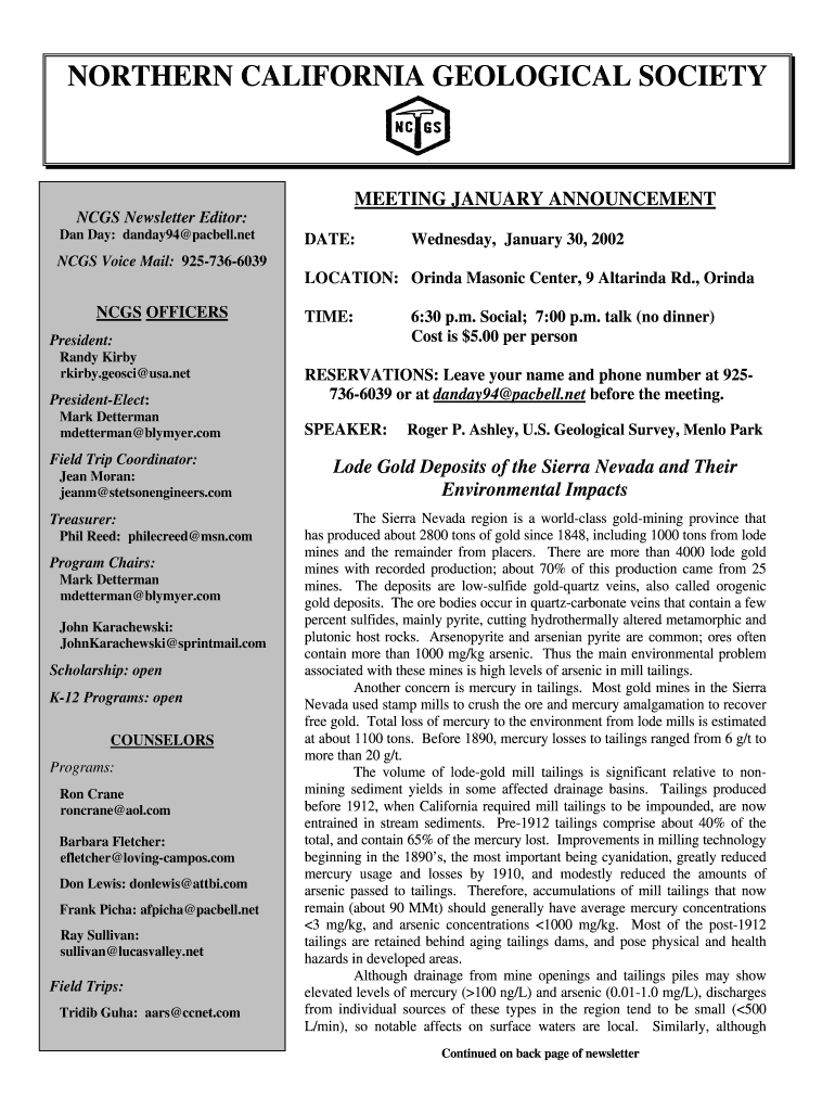 NORTHERN CALIFORNIA GEOLOGICAL SOCIETY MEETING JANUARY ANNOUNCEMENT CGS Newsletter Editor: Dan Day: danday94 Parnell.net DATE: Wednesday, January 30, 2002, CGS Voice Mail: 9257366039 LOCATION: Dorinda
