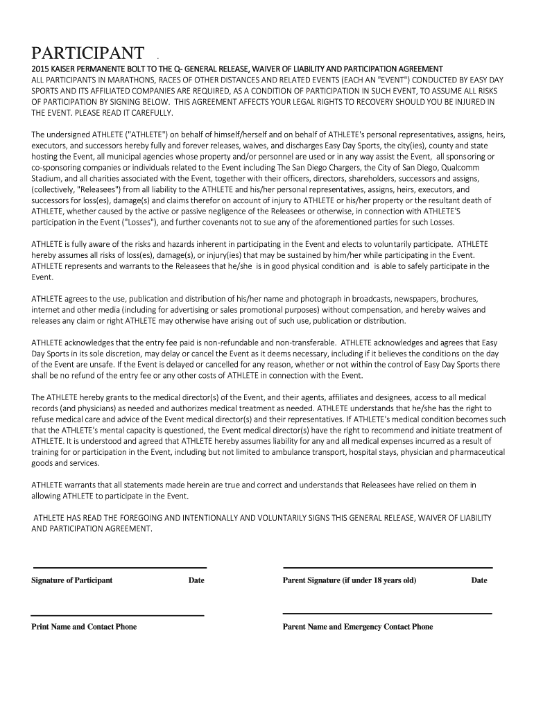 PARTICIPANT.2015 KAISER PERMANENT BOLT TO THE Q GENERAL RELEASE, WAIVER OF LIABILITY AND PARTICIPATION AGREEMENT ALL PARTICIPANTS IN MARATHONS, RACES OF OTHER DISTANCES AND RELATED EVENTS (EACH AN