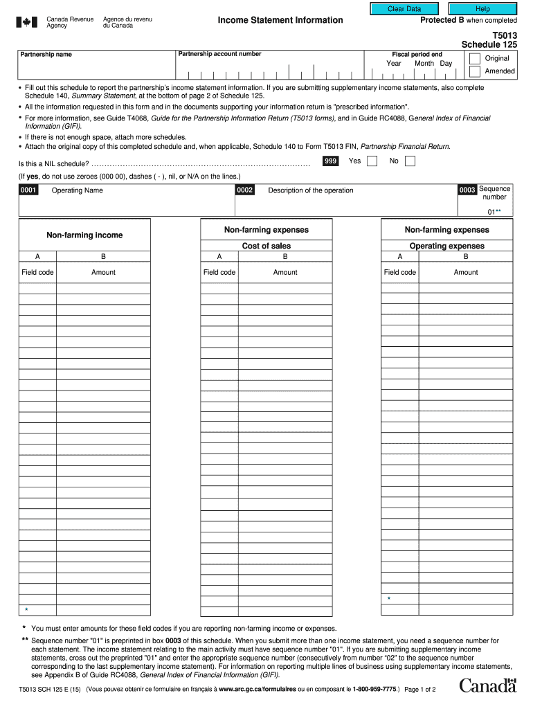 Clear Data Income Statement Information Help Protected B when completed T5013 Schedule 125 Partnership account number Partnership name Fiscal period end Year Original Month Day Amended Fill out this