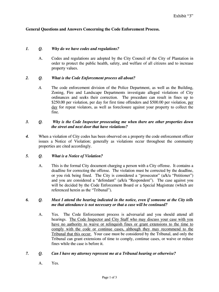 This document provides answers to common questions regarding the Code Enforcement process in the City of Plantation. It addresses the reasons for codes and regulations, the process of code enforcement,