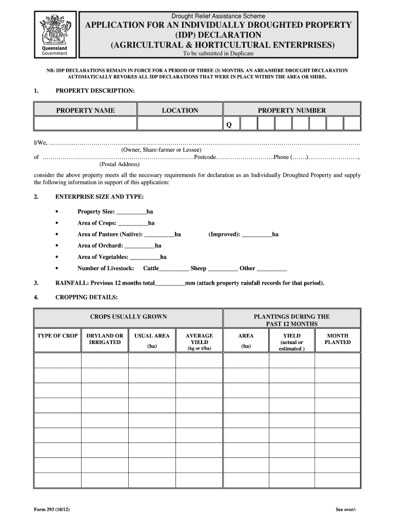 Drought Relief Assistance Scheme APPLICATION FOR AN INDIVIDUALLY DROUGHT PROPERTY (IDP) DECLARATION (AGRICULTURAL & HORTICULTURAL ENTERPRISES) To be submitted in Duplicate NB: IDP DECLARATIONS REMAIN