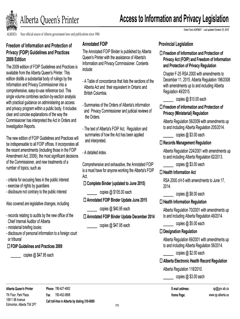 Access to Information and Privacy Legislation Order Form AQP0047 Freedom of Information and Protection of Privacy (FLIP) Guidelines and Practices 2009 Edition The 2009 edition of FLIP Guidelines and