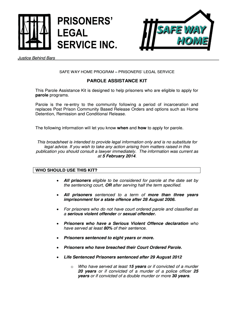 PRISONERS LEGAL SERVICE INC. Justice Behind Bars SAFE WAY HOME PROGRAM PRISONERS LEGAL SERVICE PAROLE ASSISTANCE KIT This Parole Assistance Kit is designed to help prisoners who are eligible to apply