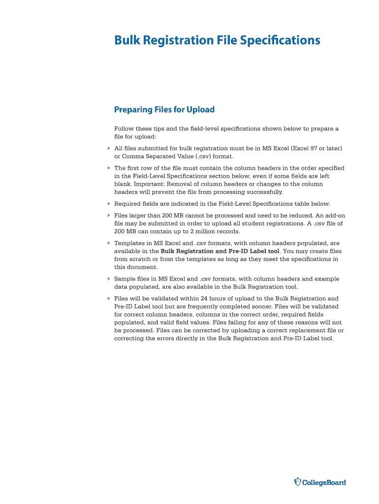 Bulk Registration File Specifications Preparing Files for Upload Follow these tips and the field-level specifications shown below to prepare a file for upload: All files submitted for bulk registration
