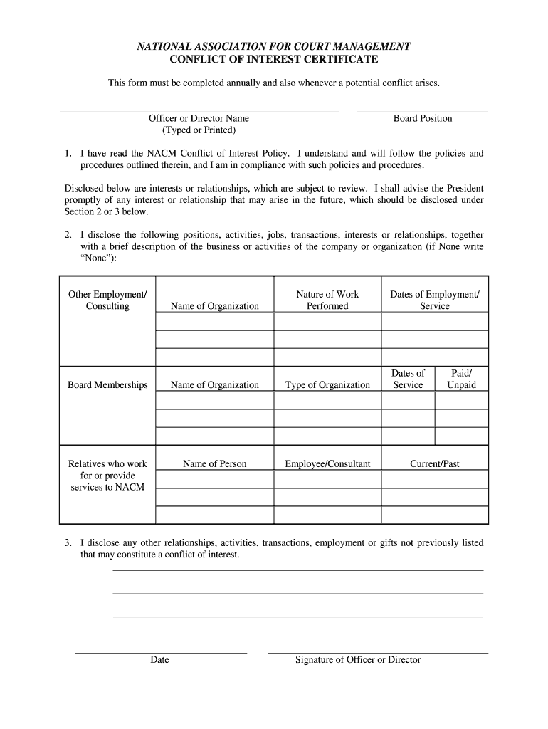 NATIONAL ASSOCIATION FOR COURT MANAGEMENT CONFLICT OF INTEREST CERTIFICATE This form must be completed annually and also whenever a potential conflict arises. Officer or Director Name (Typed or Printed)