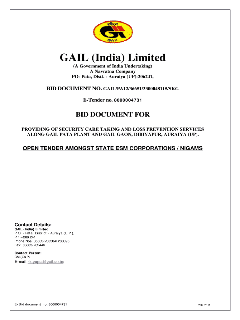 GAIL (India) Limited (A Government of India Undertaking) A Narrator Company PO Data, Dist. Auriga (UP)206241, BID DOCUMENT NO. GAIL/PA12/36651/3300048115/KG Tender no. 8000004731 BID DOCUMENT FOR