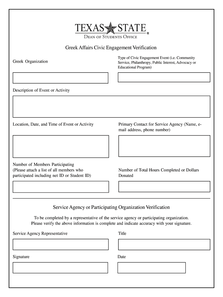 Get the free Greek Affairs Civic Engagement Verification - gato-docs its txstate