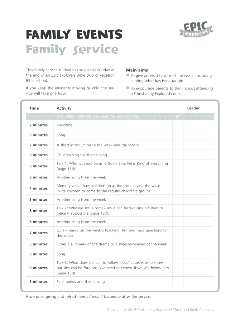 FAMILY EVENTS Family service This family service is ideal to use on the Sunday at the end of an Epic Explorers Bible club or vacation Bible school. Main aims If you keep the elements moving quickly,