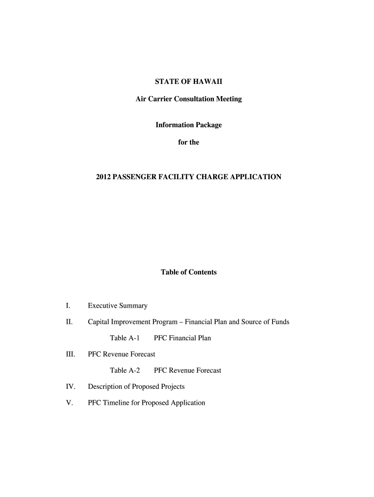 This document is an information package detailing the proposed application for the Passenger Facility Charge (PFC) to be administered by the State of Hawaii for several airports. It includes an executive