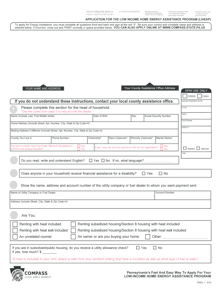 APPLICATION FOR THE LOW INCOME HOME ENERGY ASSISTANCE PROGRAM (LIH EAP) To apply for Energy Assistance, you must complete all questions front and back and sign at the red X. Be sure your correct and