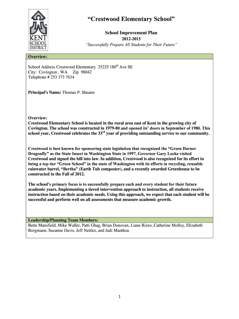 Crestwood Elementary School Improvement Plan 20122013 Successfully Prepare All Students for Their Future Overview: School Address Crestwood Elementary 25225 180th Ave SE City: Covington, WA Zip 98042